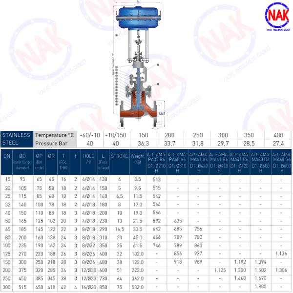 - Áp suất làm việc PN40, mặt bích EN 1092-1