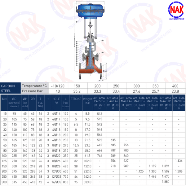 - Trang bị bộ truyền động màng khí nén AMA, tùy chọn spring return đóng hoặc mở, phù hợp cho hệ thống an toàn.